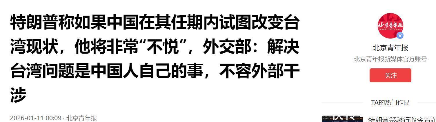 2026-01-11 00:09·北京青年报 特朗普称如果中国在其任期内试图改变台湾现状,他将非常“不悦”,外交部:解决台湾问题是中国人自己的事,不容外部干涉